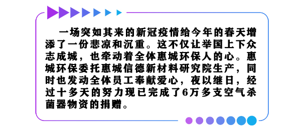 隨后,裝載五萬支殺菌器的車輛啟動,它將承載全體惠城環保人的愛心,駛達最急需的防疫一線。