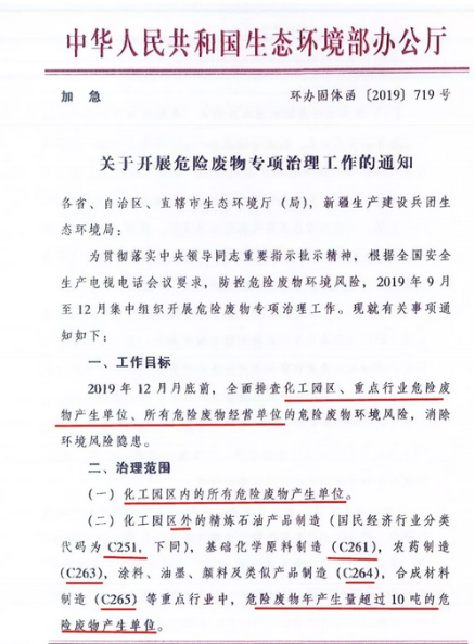 日前生態環境部印發加急文件《關于開展危險廢物專項治理工作的通知》。